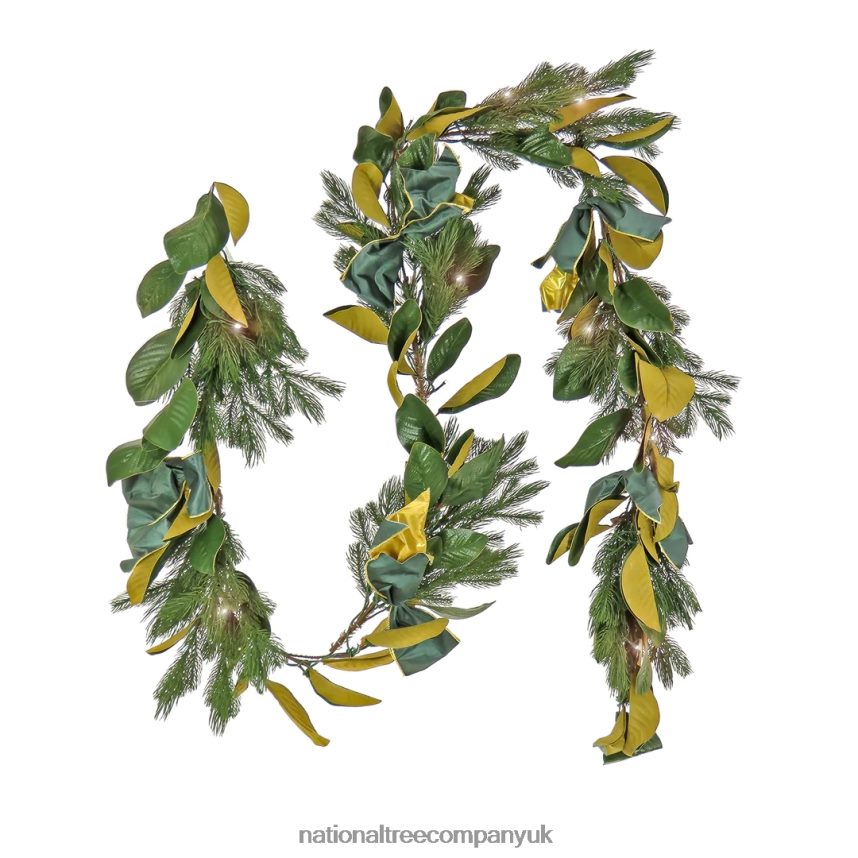 Bring the holiday cheer into your home with this nine foot Christmas Magnolia Mix Pine Garland. Decorated with a fabric bow and pre-strung with 75 warm white LED lights with remote control, this garland is perfect for any entryway, fireplace mantel, or stairway.